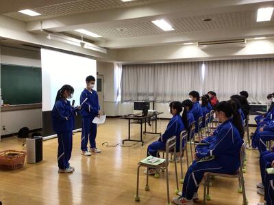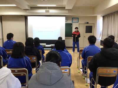 全校集会で学年委員から今回の集会の意義の説明をし,「震災からの教訓」というテーマで代表生徒が発表しました。