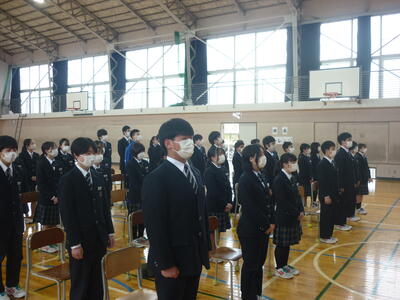 令和4年度修了式 投稿: 管理者 (2023/03/24) 3月24日(金)に、令和4年度修了式を行いました。 校長からは、各学年代表生徒に対し、1年間の課程を修了した事を証明する修了証が手渡されました。 生徒たちは、一年間で、辛いことも楽しいことも経験し、たくましく立派に成長しました。 この春休みは、新たなステージに向けて準備をし、力を蓄えてほしいと思います。 4月からの活躍を期待します。