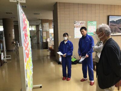 いじめ撲滅推進のため、2月4日(月)に、生徒会役員がこのメッセージボードを持って吉田東部地区町づくり協議会を訪問しました。代表生徒は、吉田東部地区まちづくり協議会会長に取組の趣旨説明し、メッセージボードの公民館への掲示を依頼しました。